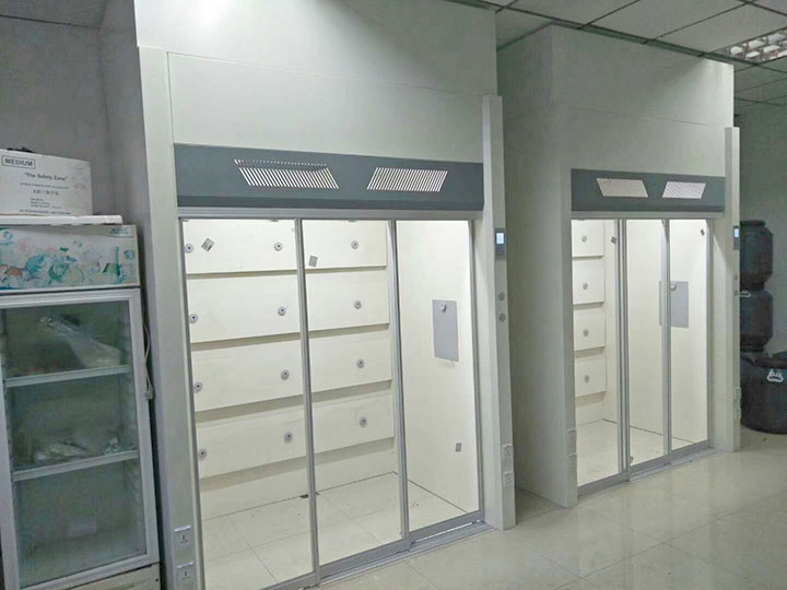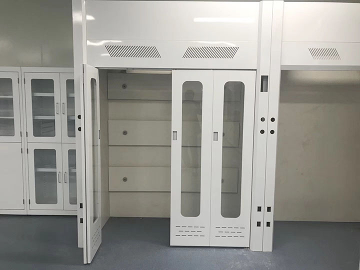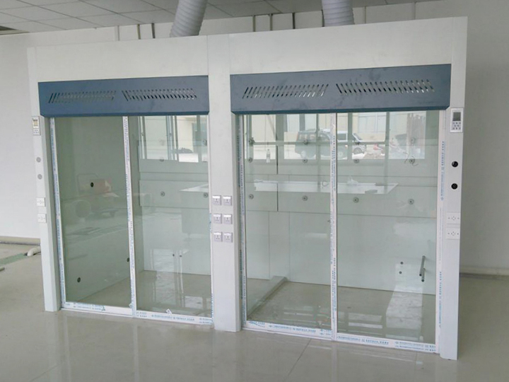 (3)走入式通風(fēng)柜的門結(jié)構(gòu)為鋁合金制的水平移門,表面處理為磷化后噴塑(淺灰色),門玻璃采用5MM厚鋼化安全玻璃。